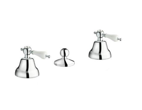Il doppio comando con maniglie in ceramica bianca assicura un controllo preciso di acqua calda e fredda, offrendo al contempo un tocco di charme retrò. La bocca di erogazione arcuata, dal profilo morbido e armonioso, permette un uso comodo e versatile del lavabo.